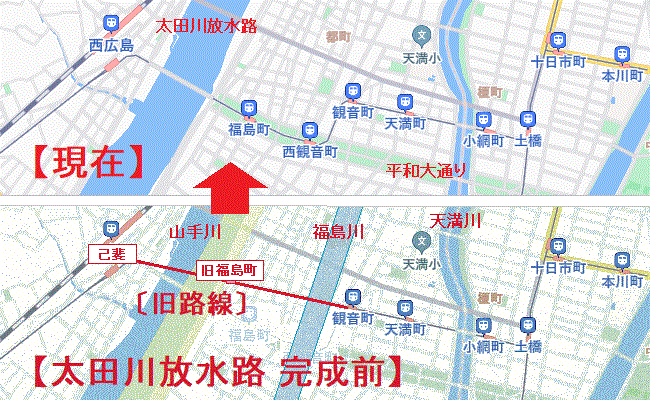 太田川放水路(山手川を拡幅、福島川は埋め立て)が作られた際、橋や道路も新設され、路線も途中から そちらに移行となった。