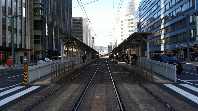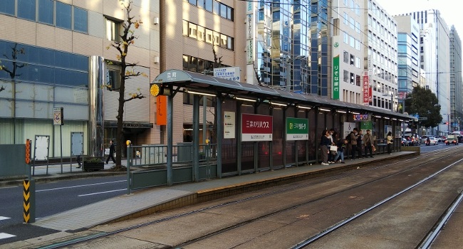 広島駅から中心街を経由し広電西広島までを結ぶ本線と、中心街から南へ伸びる広島港までを結ぶ宇品線の2路線が接続する電停。