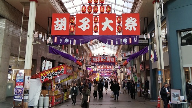 胡子神社の秋季大祭で、地元の商店街は賑わう。