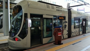 被爆80年プロジェクトのラッピング電車 前では「鉄どーもくん」が迎えてくれている。