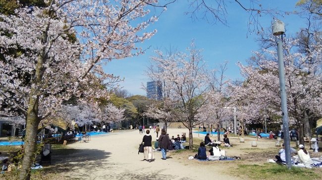 へ行ってみた。 思った通り 綺麗に咲いている。 時間は午後の1時ごろ、本日は平日なのに花見をしている人が多い、場所取り要員も居るのだろう。 明日は雨降りの予報が出ているから今日の内に花見かな?